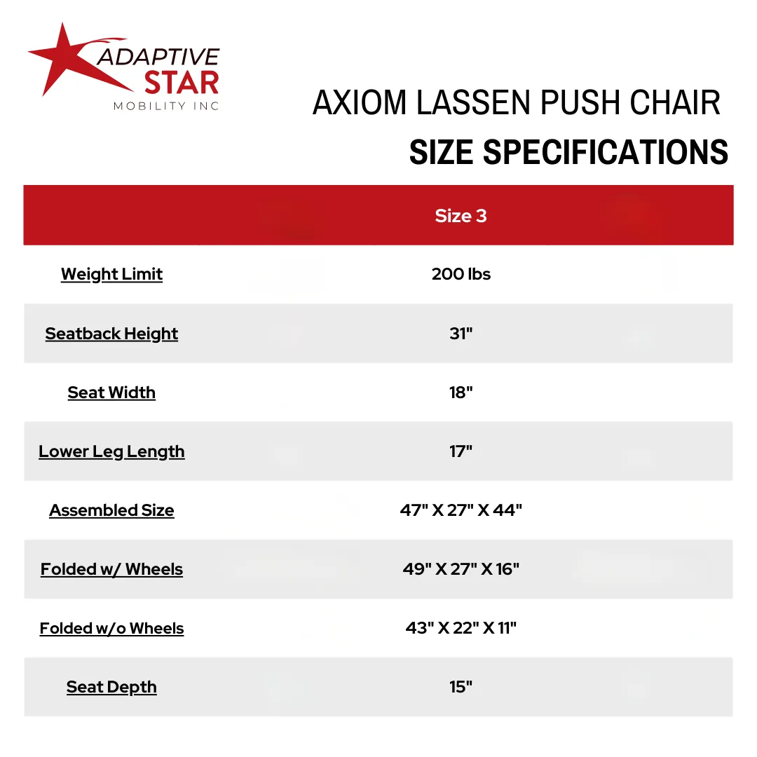 The Adaptive Star Axiom Lassen Push Chair 3 is a versatile adaptive mobility push chair designed for teens and adults who benefit from seated support during long outings, travel days, or theme park visits. Unlike standard strollers, this chair is built with a reinforced frame, supportive seating, and smooth maneuverability, making it ideal for users who may fatigue easily or require postural stability.