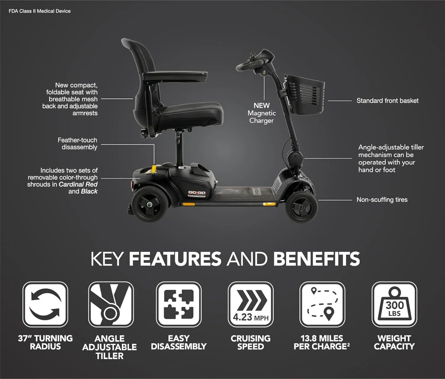Enjoy effortless mobility with the Go-Go Elite Traveller 2 (Platinum 4-Wheel)—ideal for theme parks, resorts, and local attractions. With a 300 lb weight capacity, 10-mile range per charge, and a stable 4-wheel design, it’s built for comfort and convenience. The scooter disassembles into 5 lightweight pieces for easy transport and storage, while the padded swivel seat and LED lighting add safety and comfort.